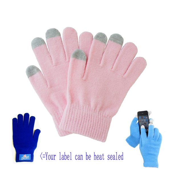 These touch screen gloves, made from fine knit acrylic yarn, with conductive fiber on three finger tips, warm and sensitive. They are applicable to all touch screen mobile phones as well as bank ATM machines.The conductive fiber on the tips is harmless, and will never scratch your screen. Many colors and three size for your option. You customized label can be heat sealed on the wrist position.