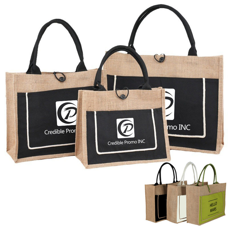 Our two tone Eco-Friendly Jute Tote Bag is made of 100% natural jute. Features with colorful front cotton pocket, matching handle and front button closure. Great for shopping, grocery, convention, trade show, giveaway, etc. We have 3 different size for your option: L, M, S. Our list price is for Large size: W18" x H13.7" x D5.5". Welcome to inquiry us now!