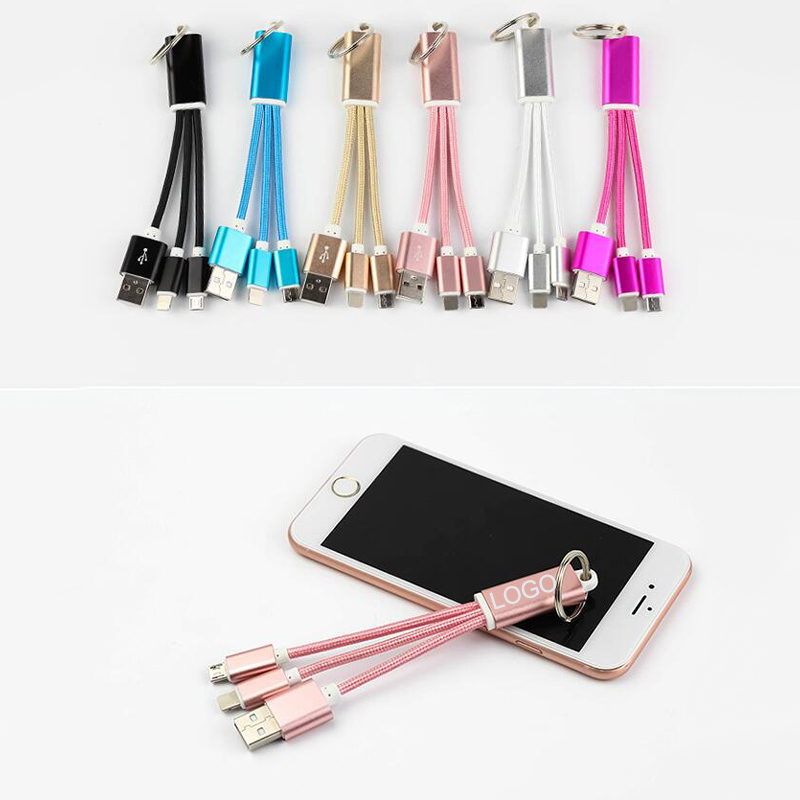 Weave nylon braided multi phone charging cable with keychain. Made from braided nylon or woven material and plastic, anti knotted, durable and compact. Length 5 1/4 inches. Charge your phone at anywhere and anytime with this charging cable. Suitable for IOS system (8Pin plug for I5/I6/I7/I8), Android system (Micro plug for Sam Sung phones, other phones and other digital devices). Great promotional item for digital and travel theme.