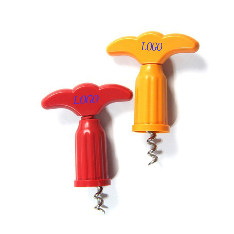 This wine Opener, made from metal and plastic. Fit it above the bottle, and rotate the handle clockwise, the stopper can be took out easily. Your LOGO can be imprinted.