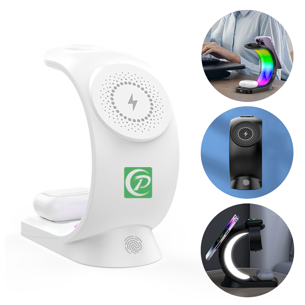 The wireless charging station adopts single poly-coil to replace dual coil for reducing device heating, more efficient and safer. The built-in RGB lights create a rainbow light effect that adds a colorful world to your desk and life. It is suitable for multiple devices can make charging easier. The crescent shape design of this wireless charging station is novel and unique. The integrated design concept will hopefully bring your convenience and keep you in a happy mood! It is not only the perfect decoration for your desk, but also very suitable for your friends and family as gifts.