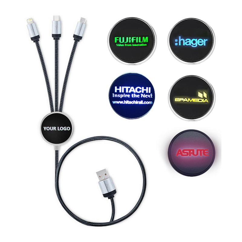 All in one solution for charging multiple devices with style and convenience. With a 2A current, this cable is designed for efficient charging. It supports a wide range of devices, including micro, lightning, type C. You can custom your logo on the center round panel, making it a perfect promotional item that not only works flawlessly but also lights up with a modern LED design. LED Light option: green, white, red, blue, yellow, orange. Welcome to inuiqry us!