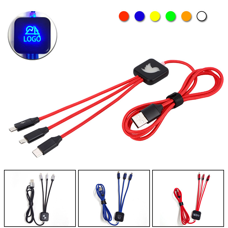 All in one solution for charging multiple devices with style and convenience. With a 2A current, this cable is designed for efficient charging. It supports a wide range of devices, including micro, lightning, type C. You can custom your logo on the center square panel, making it a perfect promotional item that not only works flawlessly but also lights up with a modern LED design. LED Light option: green, white, red, blue, yellow, orange. Welcome to inuiqry us!