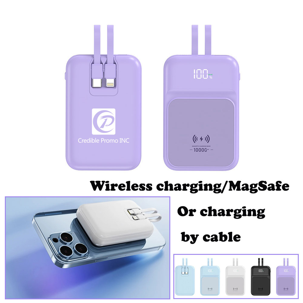 This is not just a power bank, but also a wireless charger! Come with built-in 2-in-1 charging cable with Type-C, and 5-pin ends for charging both Android and Apple devices. Features with Magsafe magnetic suction function, digital screen indicates the available power volume. This charger enables you to stay charged all day at work or on a fun night out. It's also a versatile power source for charging any wireless or non-wireless-enabled devices. Our listed price is based on volume 10,000 mAh, we also have 5,000 mAh option, welcome to inquiry us!