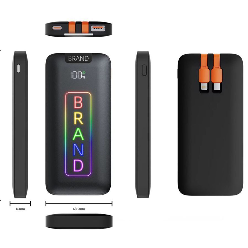 This is available in black and white and the logo can be done in color. This is an especially good product for promotional purposes. The colorful logo will make your gift stand out. This rechargeable has a large battery that is 10,000 mAh. And this one comes with two cables. Our offer is in normal box package, and the package can be according to your requirement.