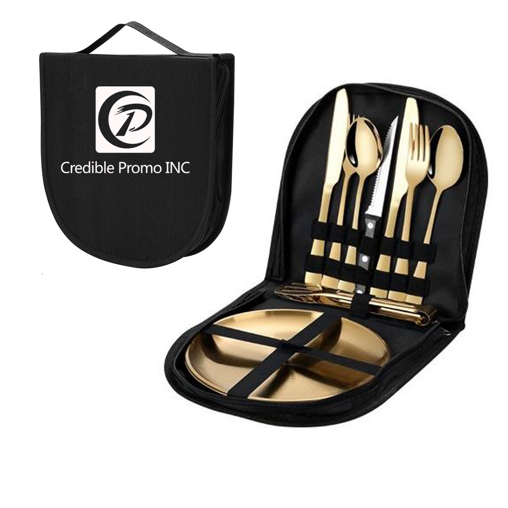 10pcs in 1 package, includes 1 x tongs, 2x spoons, 2x forks, 2x Serrated Knives, 1x Butter knife, 2x 8" Stainless Steel dinner plates. Any of these stuffs has its own place, so units don’t get smeared. Perfect kit for girl and boy scouts, camping, backpacking, hiking and family picnics. Your logo can be imprinted on the bag.