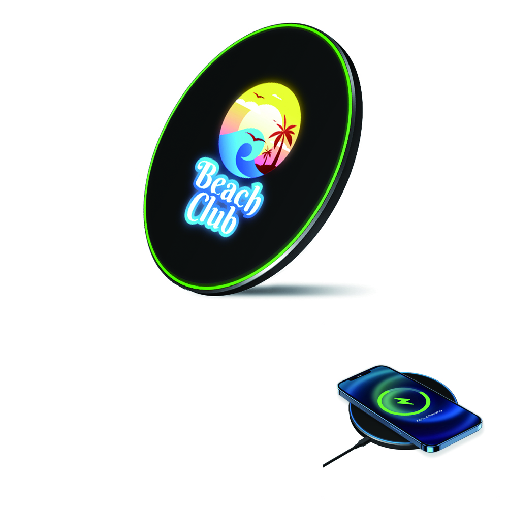 Our Wireless charger pad size 0.3inch thick, 3.9inch diameter, easy to put in your pocket. And it is easy to carry during travel or business. Light Up Full Color Logo is available to show your company well. It is a good gift for adversting, events, tradeshows , office and meeting.