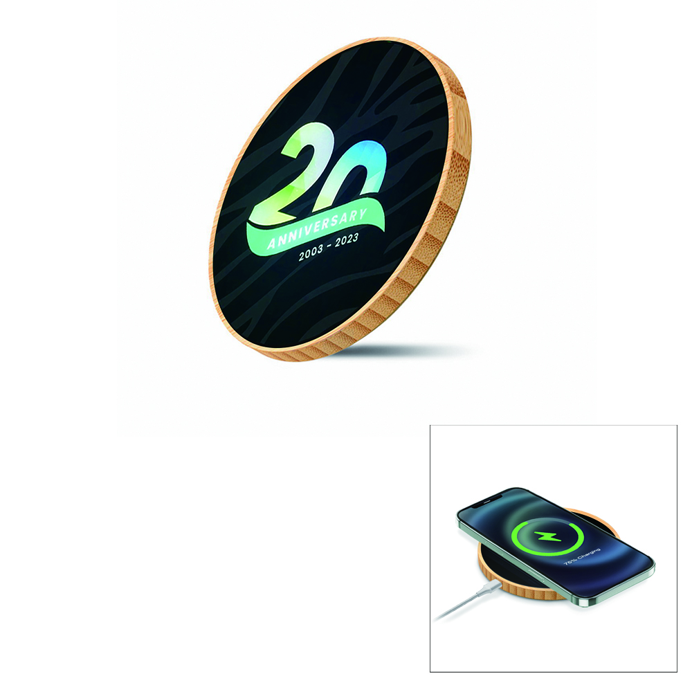 Our Natural bamboo Wireless charger pad size 0.4inch thick, 3.9inch diameter, easy to put in your pocket. And it is easy to carry during travel or business. Full color light up logo is the best advertisement for your company! Single color logo is also available and the price is cheaper.