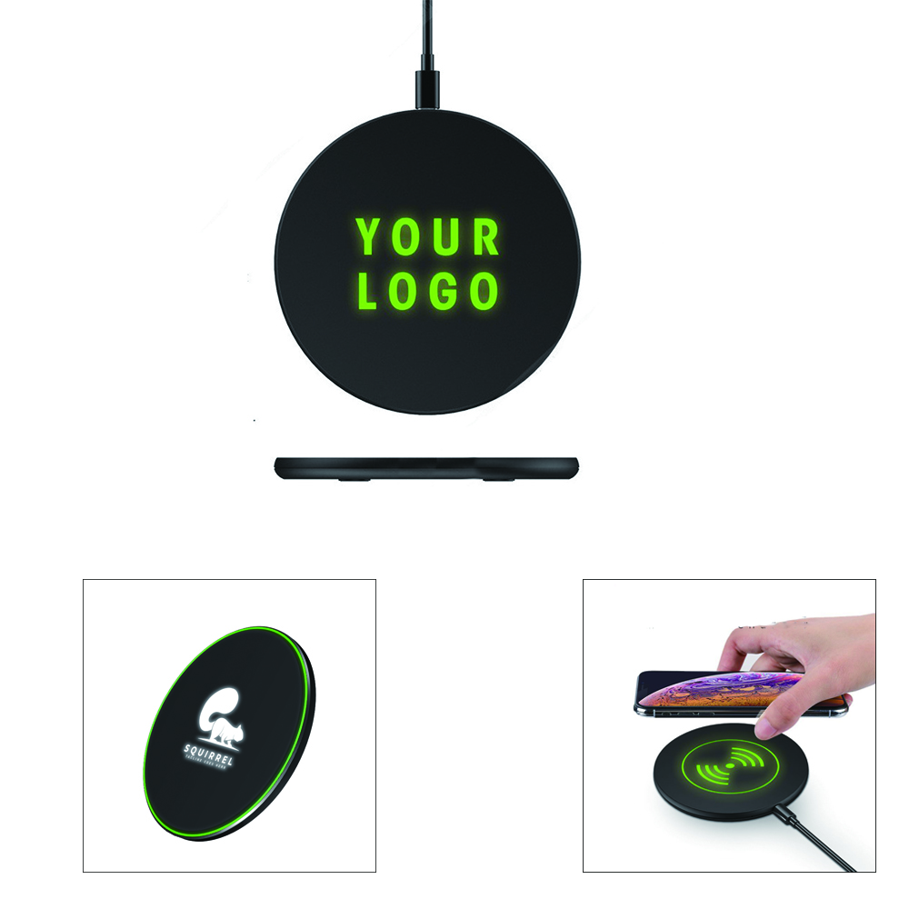 The 15W LED light up logo wireless charger - a sleek charging solution perfect for promotional purposes. It features a distinctive outer ring indicator light that glows green before charging and turns blue when charging, comes with a charging cable. Say goodbye to tangled cables and enjoy convenient charging on the go.