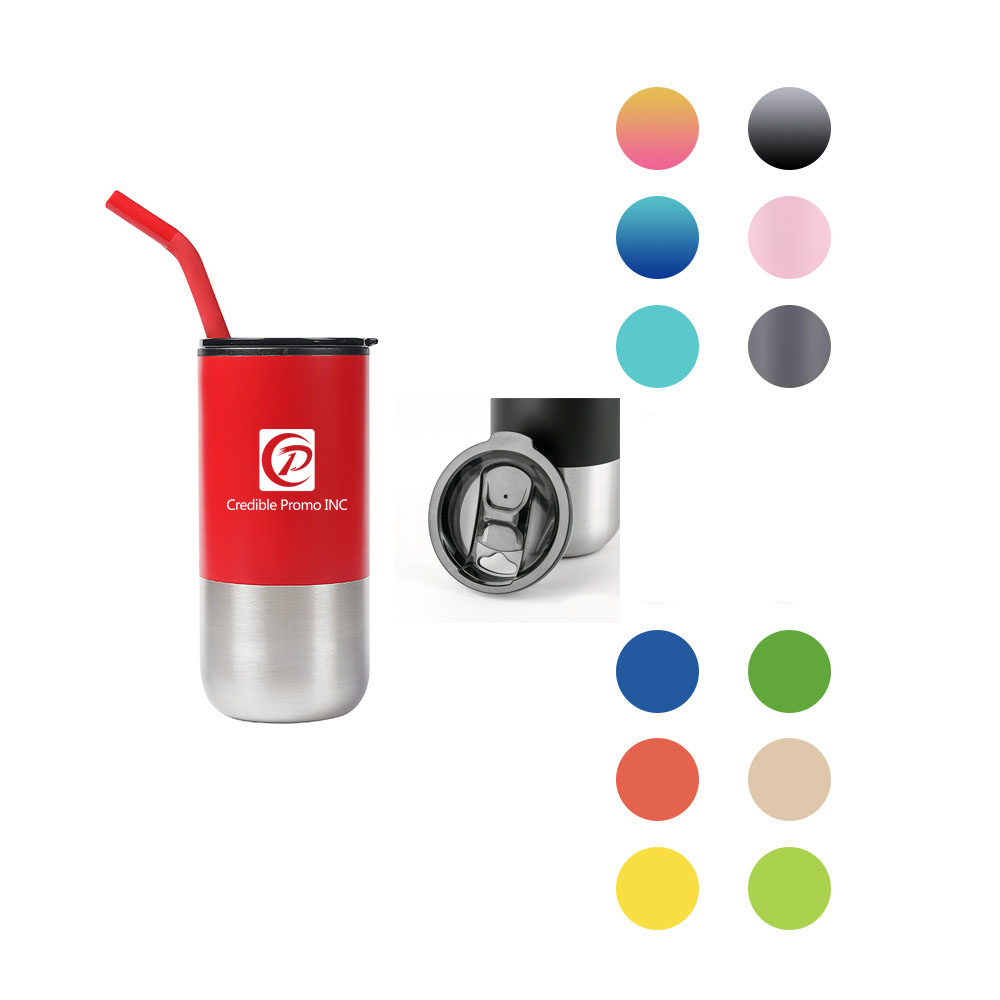 Durable double-wall construction, Spill-proof lid with slide closure to avoid messes, Insulated to provide lasting temperature control, Includes one reusable stainless steel straw with silicone. Quantities below 1000, black and white only. Above 1000, custom colors are available.