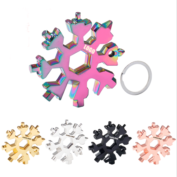 Made of stainless steel, durable, wear resistant exquisite workmanship,not easy to rust. Unique snowflake shaped Small and light, it will not burden you. You can put it anywhere. Snowflake multi tool with 18 features: flathead screwdriver, #3 and #2 phillips screwdriver, 4, 5 and 6mm allen wrench, box cutter 1/4 in end wrench 7, 8, 10, 11, 12, 13 and 14mm end wrench. This multi tool can be used for opening beer bottles, turning screws, fixing skis, bicycles, toys and so on. This kit can help you fix most problems of your bike. Your custom logo can me laser engraved on.