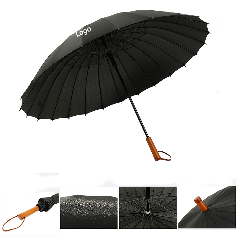 Our large umbrella has 24 reinforced ribs, made of premium fiberglass and stainless steel, super solid but lightweight. Umbrella structure itself can be supported against winds, and the umbrella pole itself can withstand the pressure. Except put your artwork on the large area of panel, your logo can be also laser engraved on the wooden handle. Free self fabric colored sleeve. Welcome to inquiry us!