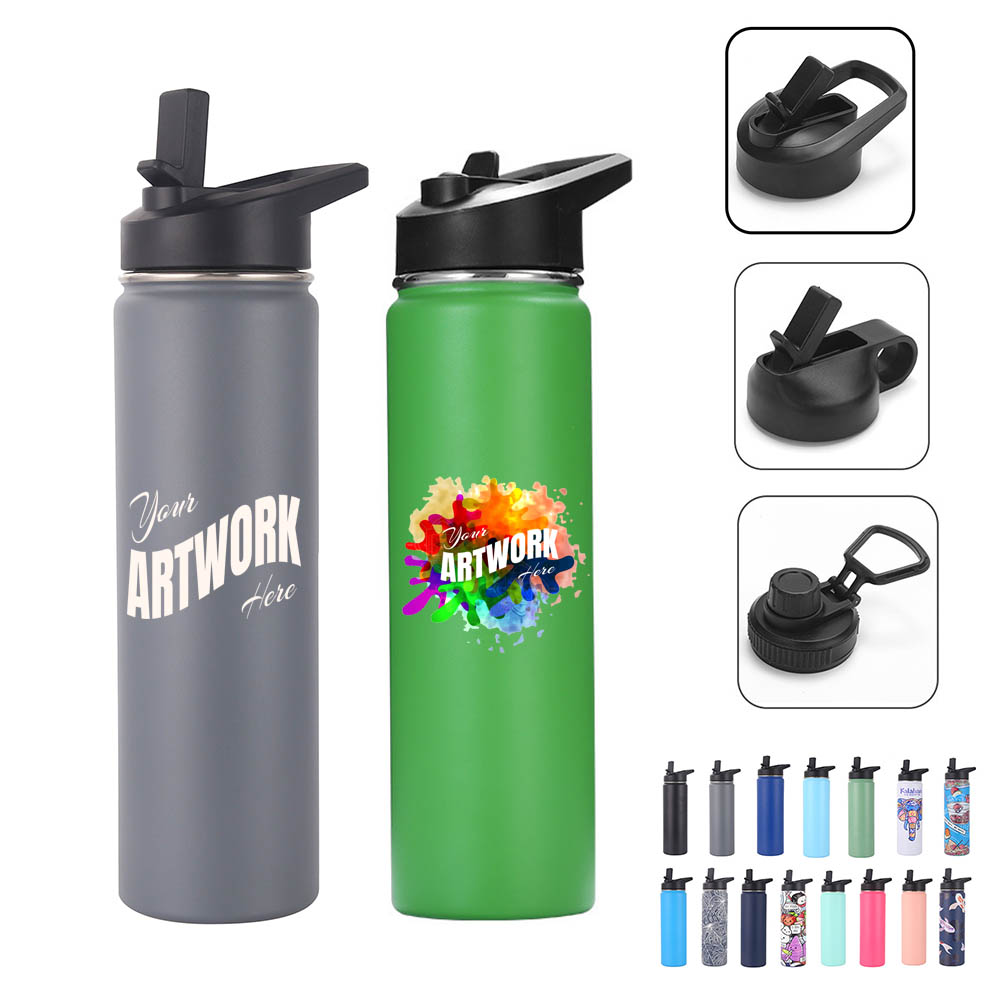 This 25 oz vacuum insulated water bottle features with a screw on flip-top straw lid and an easy carry loop handle, made from double wall food grade stainless steel material with powder-coated finish. It keeps beverages hot for up to 12 hours and cold for up to 24 hours, great for the gym, school, or outdoor adventures. Get either the standard permanent laser engraved imprint or an optional full color imprint, our list price is based on laser engraved or 1 color imprint. We provide multiple different lid option, welcome to inquiry us!