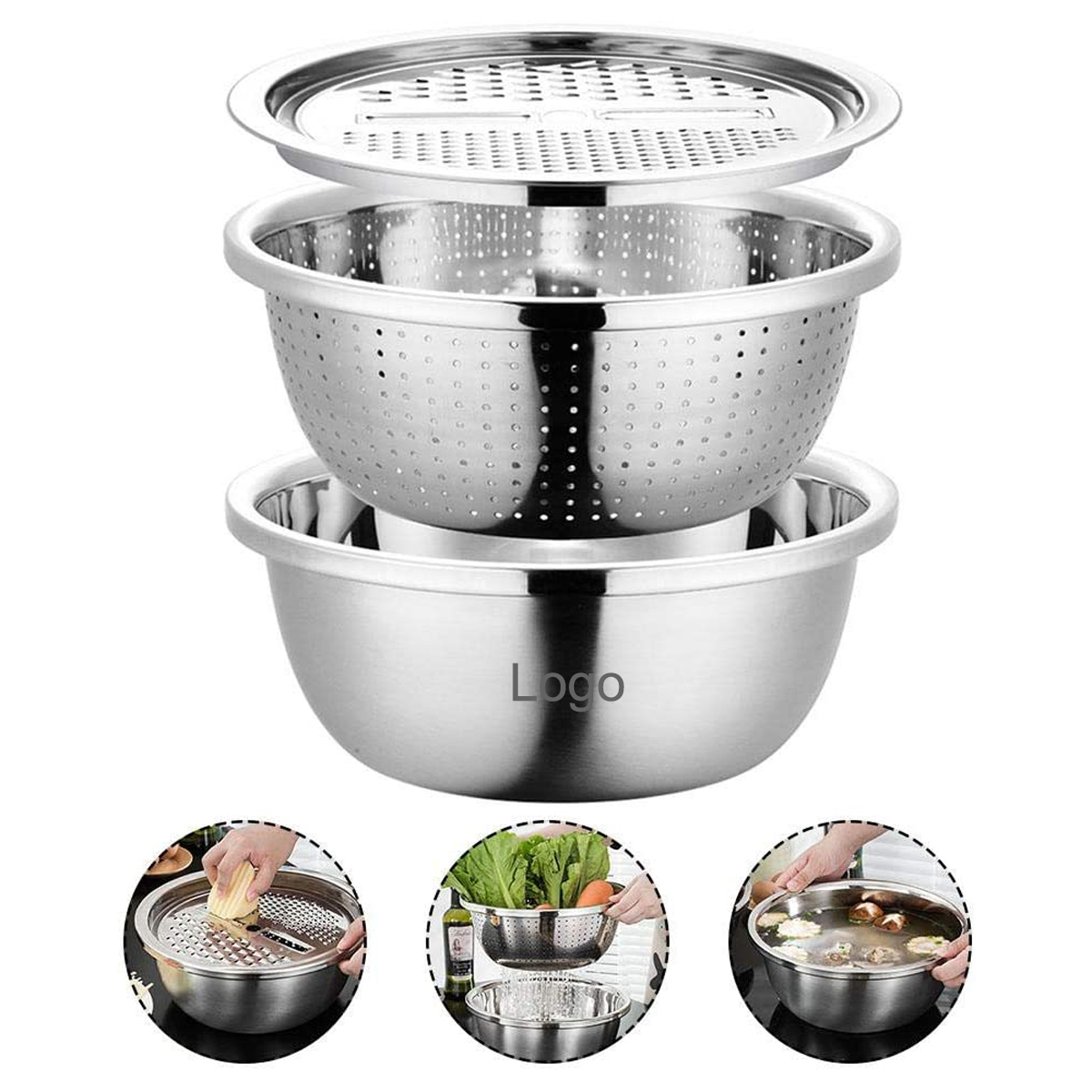 3 in 1 New stainless steel slicer, colander set includes 1 fine strainer, 1 basin and 1 peeler. Using it for washing, rinsing, shredding. The food container and the drain basket to instantly slice and wash immediately, saving you more time. A good helper for kitchen and used in most fruits, vegetable, food. Largely avoid rust and dyeing caused by food residues and kitchen grease stains, safe, healthy and durable enough. Easy to clean and looks high level and stylish. It will only bring more fun to your cooking.
