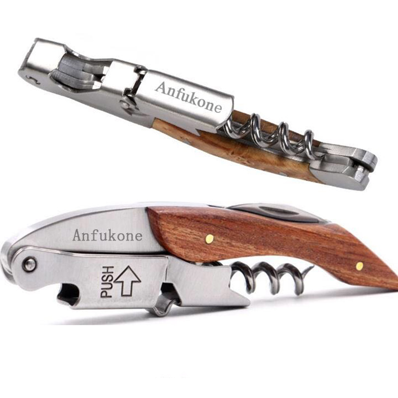 3 in 1 multi-function wood handle wine opener, stainless steel body with comfort-grip wood handle, will last for years. Functions as a double hinged corkscrew, a foil cutter knife and a bottle cap opener. Designed for promotional gifts at restaurants, bars, and household use. Logo can laser engraved on the head of opener.