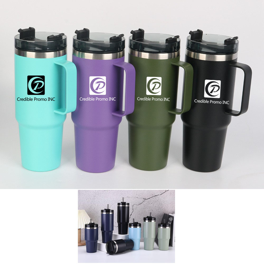 30 oz double walls insulated stainless steel auto tumbler. Features with straw and handle, easy to place and take away in your car, portable and convenient. Fits in most auto cup holders. Double-Wall structure keep drinks hot or cold for hours. BPA-free / FDA Compliant material. Hand-wash only. Perfect for Travel Theme, Welcome Gifts, Corporate Outings or to Your Executive Staff. Great for Coffee and Gift Shops.
