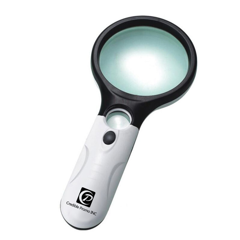 Hand-held reading book magnifier with LED light. Two magnifier glasses inside, bigger one is 3X times magnifying, diameter 2.95". Small one is 45X times magnifying, diameter 7/8". Three LED lights design, great for reading, jewellery evaluating, and other magnifying functions. Batteries included. Two item colors for your option. Your customized logo can imprinted on the handle.