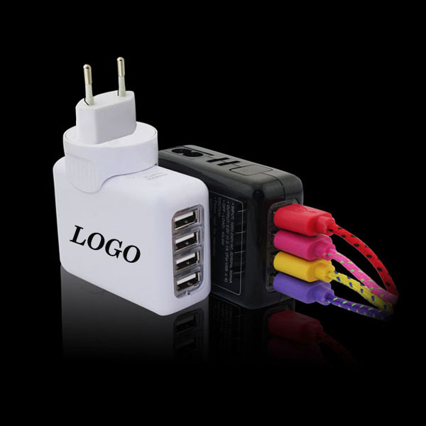 Universal All in One worldwide travel power adapter charger with 4 USB charging ports on one side. Each plug is a separate piece for international outlets. 4 plug adapters included support outlets in USA, UK, EU, AUS, Japan, China etc., covering more than 150 countries over the world.