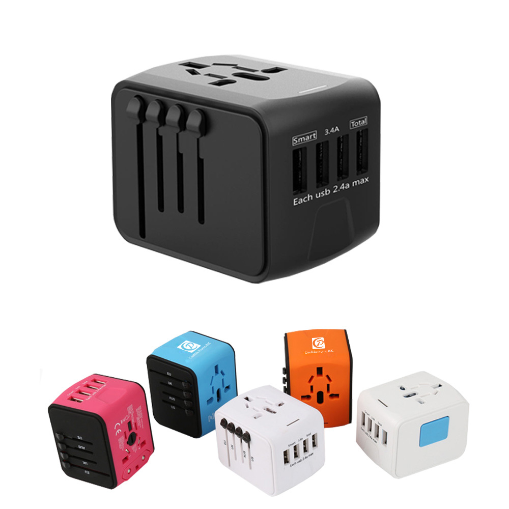 This all-in-one travel plug adapter integrates 4 retractable plugs (US, EU, UK, AU) and USB ports, which are available in 200+ countries. Built-in auto-resetting fuse to protect against overload or short circuit. Support simultaneous charging of multiple devices such as cell phones and table PCs. Ergonomic design suitable for one-handed operation. Perfect promotions with your LOGO.