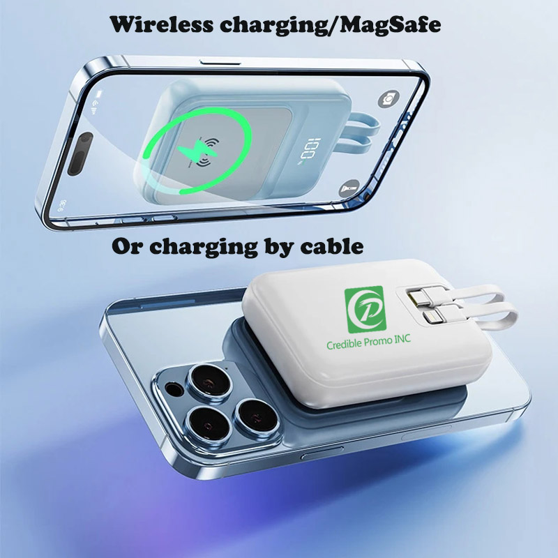 This is not just a power bank, but also a wireless charger! Come with built-in 2-in-1 charging cable with Type-C, and 5-pin ends for charging both Android and Apple devices. Features with Magsafe magnetic suction function, digital screen indicates the available power volume. This charger enables you to stay charged all day at work or on a fun night out. It's also a versatile power source for charging any wireless or non-wireless-enabled devices. Our listed price is based on volume 5,000 mAh, we also have 10,000 mAh option, welcome to inquiry us!