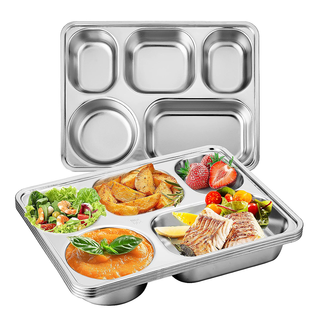 Our tray is made with food-grade stainless steel, which is not easy to break or deform and is rust and corrosion-resistant. Designed with 5 compartments, which is an ideal tray to make food variety. We also offer different trays in terms of sizes and shapes. Please contact our sales rep for more information.
