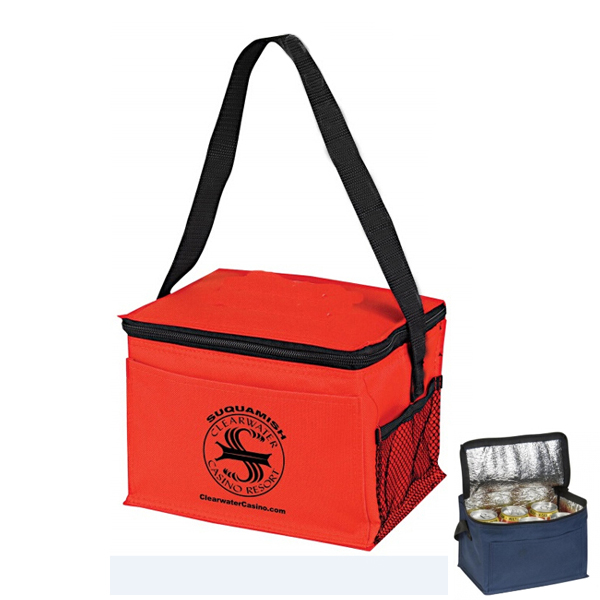 Use this economic 6 can cooler as your next giveaway. Features a front pocket and side mesh pocket. Size is 11"X6"X4". Made from 600D Nylon. Many colors for your option. Your customized LOGO is welcome on the generous area.