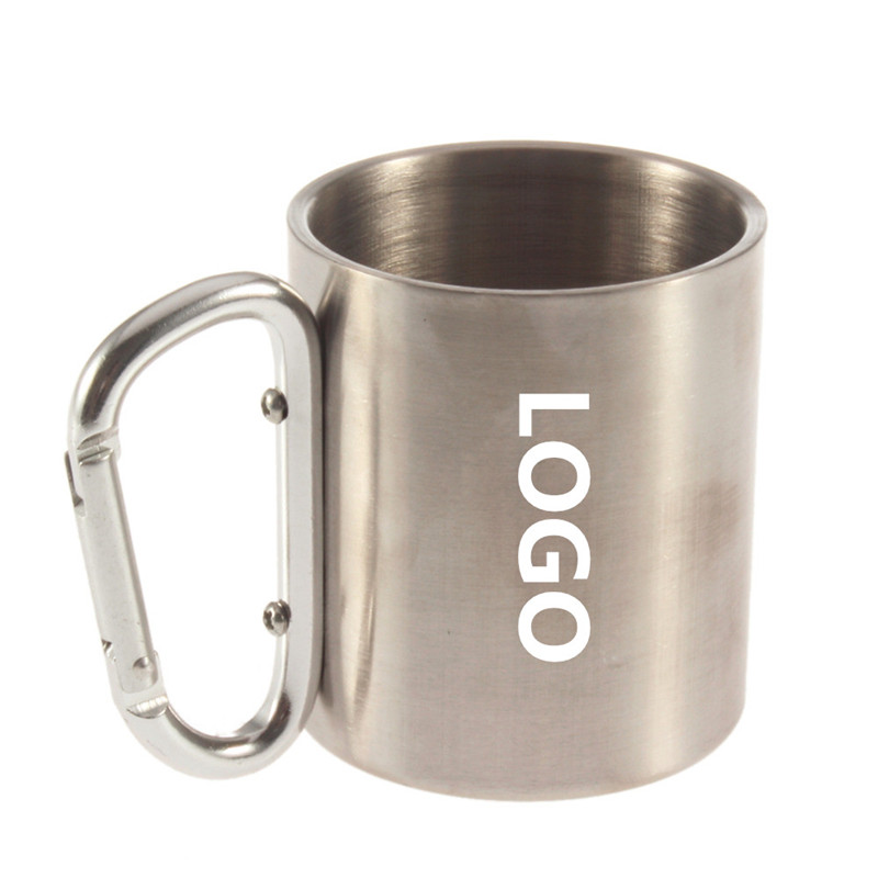 It's 220ml/7OZ stainless steel mug thicken outdoor camping cup with carabiner hook, it's useful for you when you go camping and climbing. You can add laser logo on the mug body, it's a nice gift for enthusiasts.