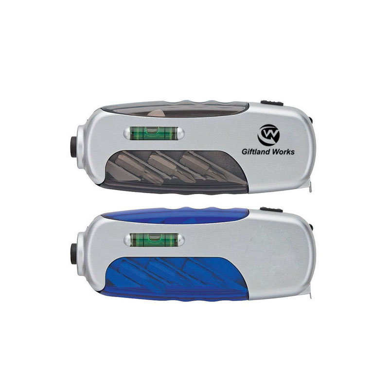 Promotional screwdriver set with LED flashlight is a compact multitool with 3 philips and 3 flathead driver bits, LED light, level and 1 meter tape measure. Three AG3 / LR41 batteries included.