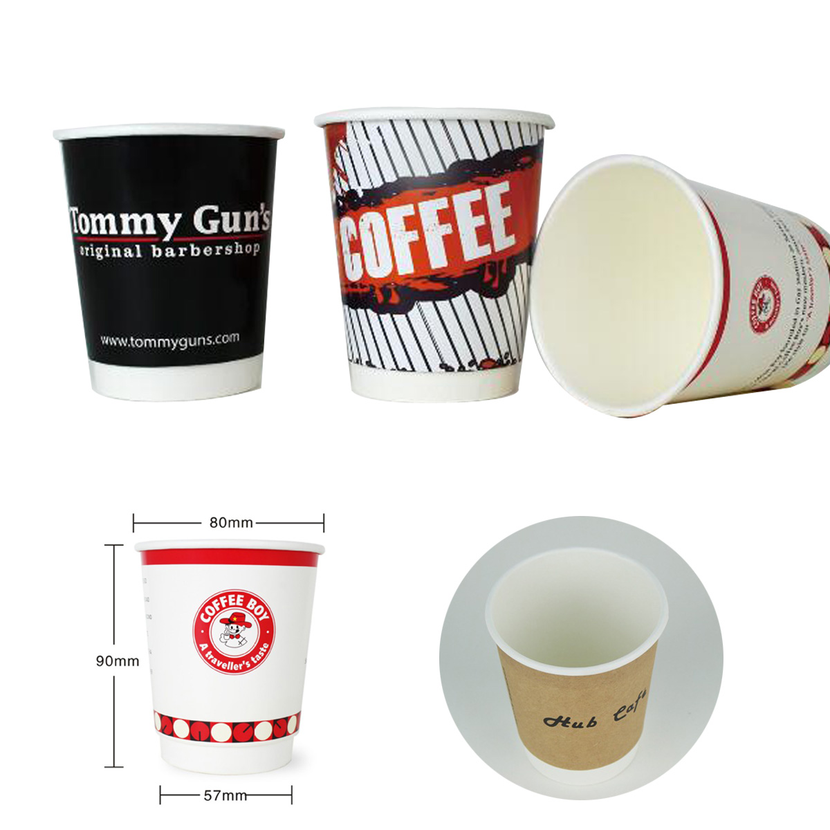 9oz double wall paper drinking cup with gloss or matte finish full color wrap print ideal for hot and cold drinks. Your customized artwork can be imprinted on the whole outside. There are three sizes available: 9oz, 12oz, 16oz ,and with different styles. Prices are based on 9oz double wall cups with no lids. Ocean shipment from China.
