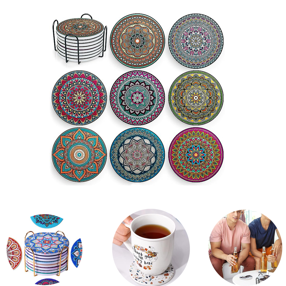 Our cup coasters are made of high quality ceramic surface. The ceramic coasters adopt cork base bottom design, prevent your table and furniture from scratches and scuffs. And they can stay in place well, tightly stick to the desktop. Moreover, the ceramic surface of the coaster can withstand high temperatures, preventing your table from getting burned. Hand washing recommended. This quotation is the price of a set, includes one black shelf and 6 pcs coasters, the shelf color can be changed to gold, the number can be increased or decreased. Welcome to consult.