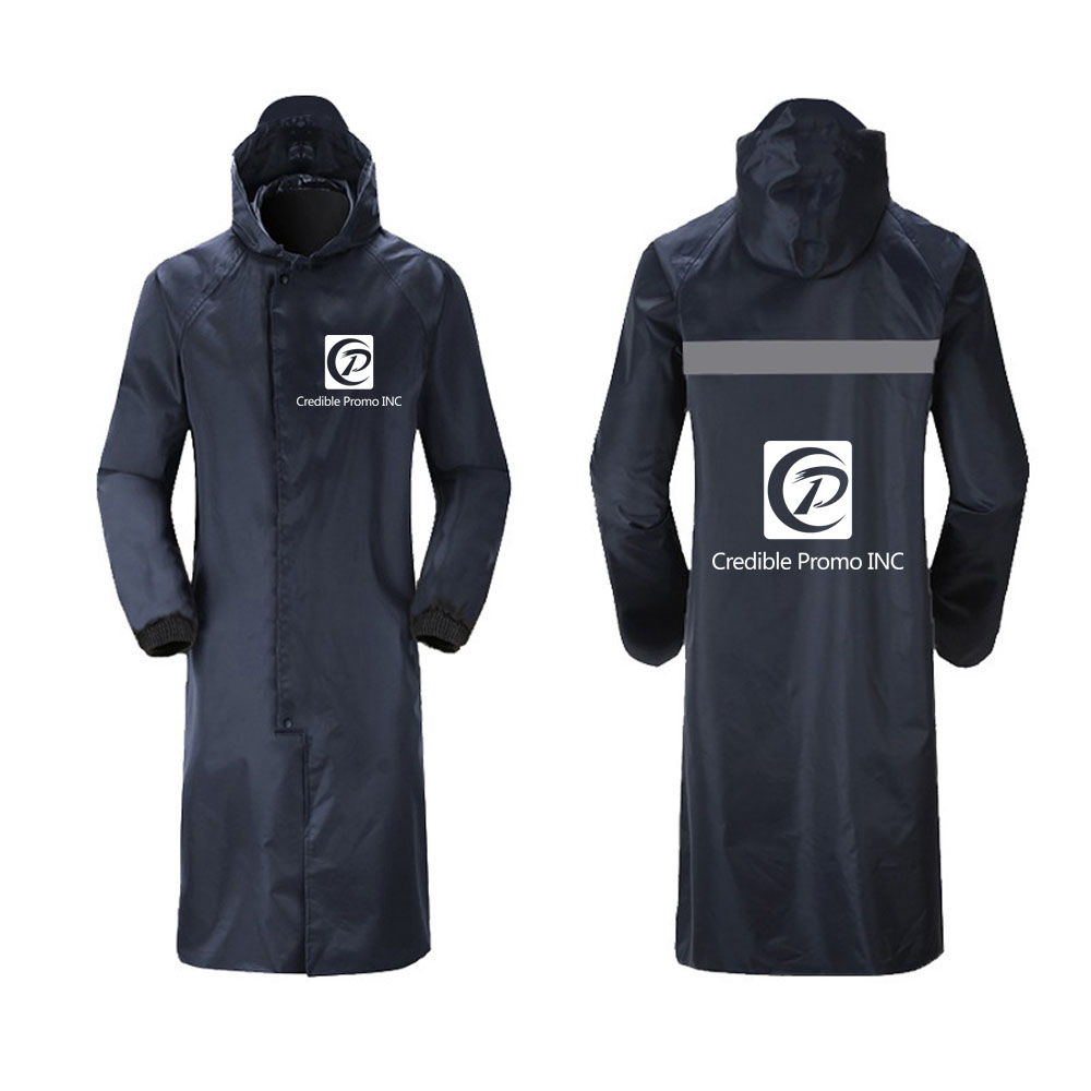 The Adult Hooded Raincoat uses high-grade Oxford cloth, PVC sealant at the line, will not seep. The iron zipper and buttons are beautiful and durable. Windproof elastic cuffs can better withstand storms. High brightness luminous strip design enhances your safety protection. Each part of the raincoat is neatly aligned to show the high-end temperament. Our prices include a logo in one location! 32" L x 21" W