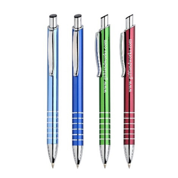 High quality ballpoint pen, made from aluminum pen body and plastic silver plated trims. Laser engraved grip. Your LOGO can be laser engraved or silk screen imprinted on the pen body. Many colors for your option.