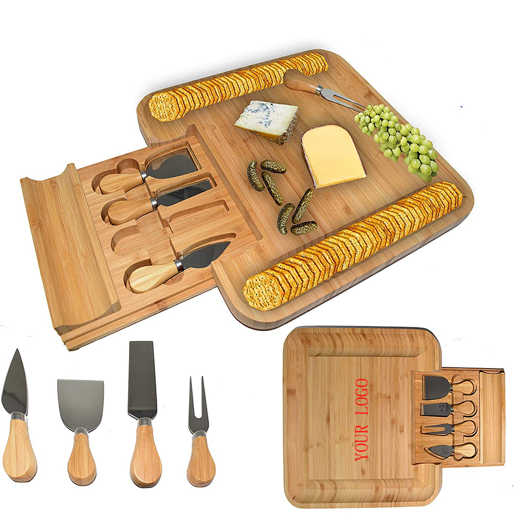 Bamboo Cheese Board Set With Cutlery In Slide-Out Drawer