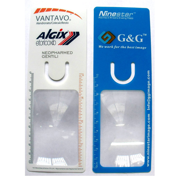 This bookmark magnifier, made from PVC. 3X Magnification. It features a ruler in 4 inches and 10 centimeters and clips onto pages as bookmark to add convenience. It's flexible and unbreakable. Great promotional item as bookmark, desktop accessories, giveaway at the trade show and other activities.