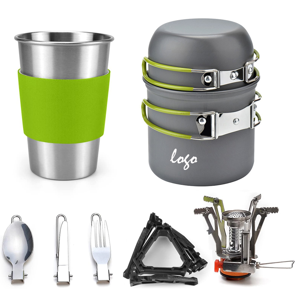 This full camping cookware set includes a mini camping stove, a pair of aluminum non-stick cooking pots, a foldable fork, spoon and knife and a 16-ounce stainless steel drinking cup. The folding design allows this kit to be stacked and held together with the included clamps and straps. Just slip it into your bag or backpack. The anti-heat pot handles and silicone cup sleeve keeps fingers protected. Add your school, sports team, organizational or company logo or message to customize.