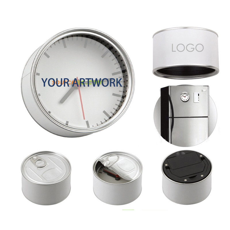New design! This can shape clock is smart item, it is not only a clock, also be as a fridge magnet, you can put it on anywhere. Perfect for promotion gifts, clubs, super markets, advertisment, personal gift, souvenir, retail, school, home decoration. Your logo can be imprinted on surface or around.