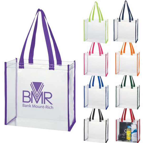 Add convenience to their trip to see their favorite team with this Clear PVC Tote Bags.Eco-friendly 20silks thickness, with a 6" gusset and 22" long handles that make it easy to carry with you all day. Go for the home run with this new, clear tote bag with popular trim color options! Customize this bag with your logo to maximize brand exposure. Sports fans will be cheering all season long, order yours today!