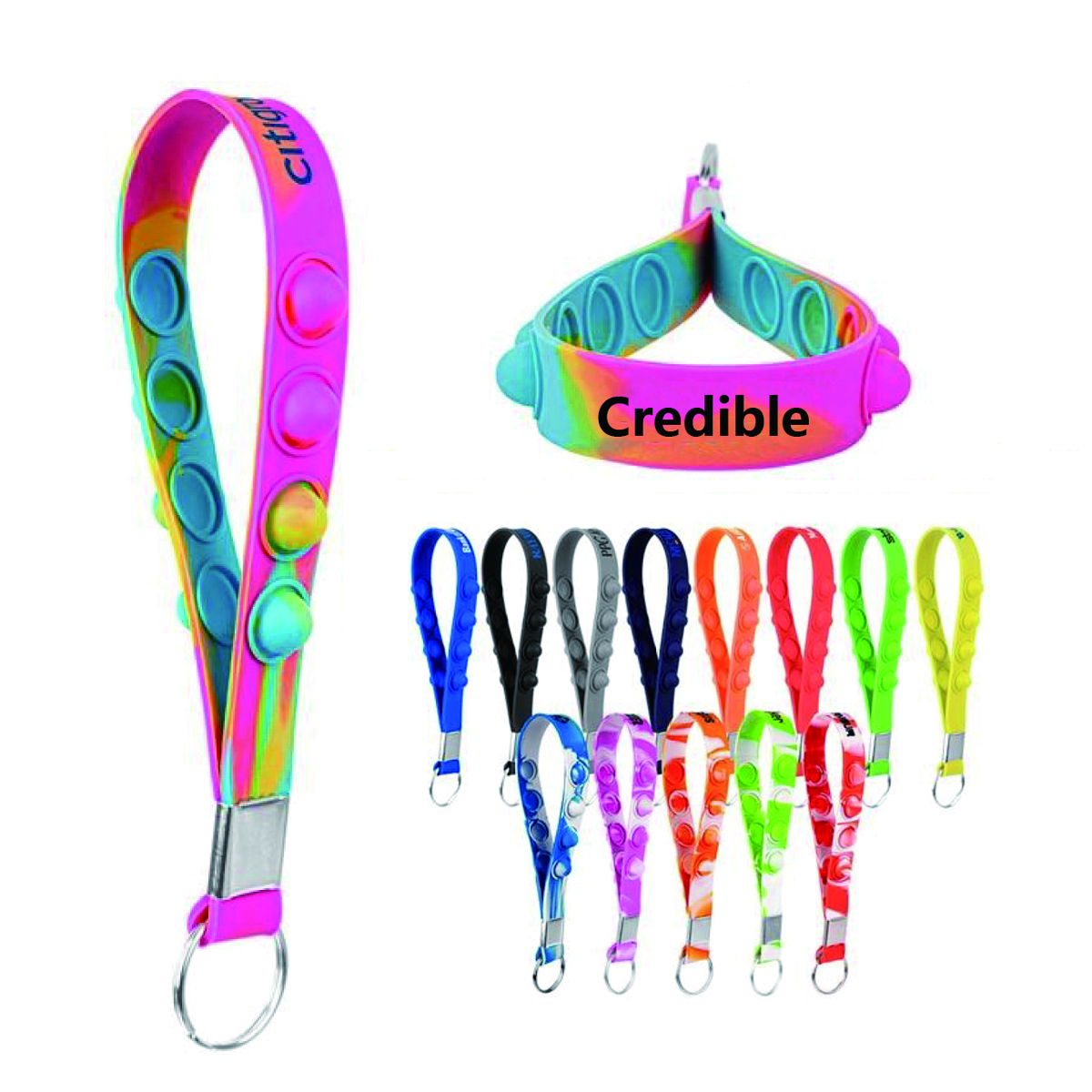 The colorful popper stress reliever key chain is made of high-grade silicone popper bubbles that can be pressed and released to reduce stress and anxiety or boost concentration. The durable metal split ring allows you to hang the toy from a keychain, bag, purse, belt loop, or more for easy access. With your custom logo pad printed on the front, this stress reliever keychain makes a great relaxation and entertainment toy.