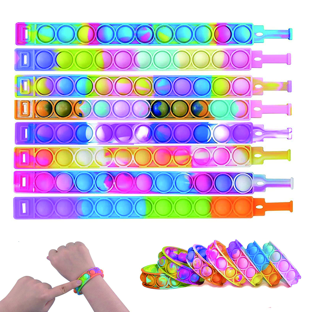 Simply press the bubbles down and they make a slight popping sound. The bracelets set is adjustable, you can adjust the size according to actual needs due to everyone's wrist is vary from each other. Comfortable to wear, wristband design, soft feel, suitable for most people to wear and play. These multi-color pop wristband bracelets are made of high-quality silicone material. The material is soft and easy to keep clean, will not cause any harm to humans and pets.