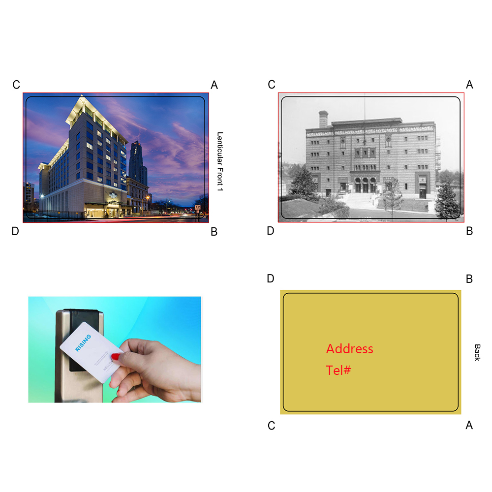 This custom key cards are great for hotel event. Made of PVC, can be full printed on both sides. And we also can do 3D lenticular print, that means the imprint is different when you see from different directions, makes your hotel special. We have various chips to match different systems. Please help advise chip type when inquiry.
