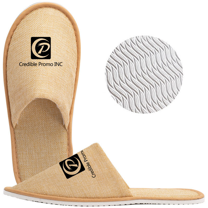 This closed toe disposable slipper is made from linen, with anti slip soft EVA foam on the bottom, thickness appr 5.0 MM. Length appr 11 1/4", one size fits most. Three item colors for your choice. It's perfect for resorts, hotels, motels, airlines, spas and travel. Welcome to inquiry us with your design.