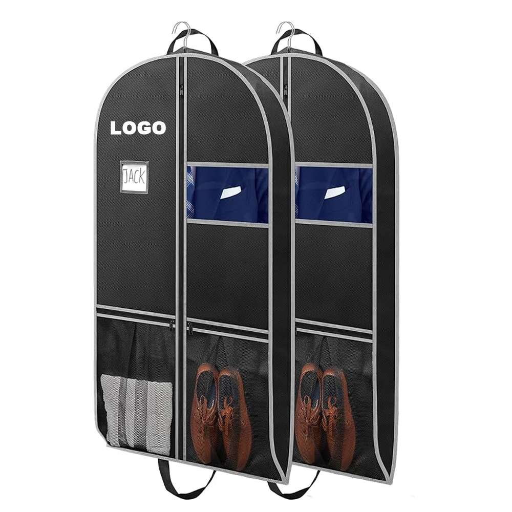Portable and fold-able dress garment bag can be used to hang and protect any type of clothing. It with a Plastic PVC card/tag holder for identification; the clear window allows you to see which suit is inside without opening the bag. 2 large breathable pockets at the bottom of the suit bag are big enough for a pair of ankle boots and a change of clothes.
