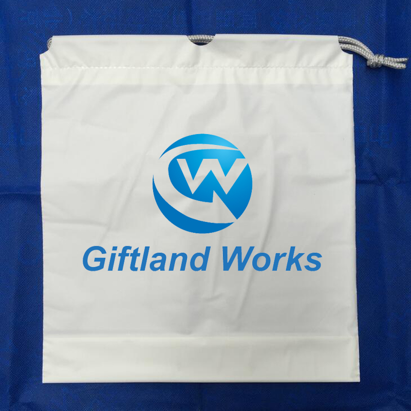 Custom recyclable drawstring bag, made from double plastic layers. Single rope design. Size is width 13 1/2" x height 18". Suit for household, shoe bag, laundry, tablet PC, toy, wash bag, or other use. Custom size is available.