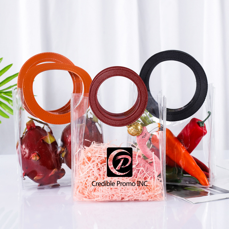 New Fashion Clear Bag Arrive! Made from transparent waterproof PVC material. This hot sale clear bandbag features with large round PU leather handle, which makes the whole bag more sturdy and upstanding! It's not only can be used as shopping bag, travel bag, beach bag, wash bag, cosmetic bag, but also can be used to pack candy, flower, food, wedding gifts or other gifts. Our listed price is based on size H7.8"xW7"xD4", custom other size is available, welcome to inquiry us!