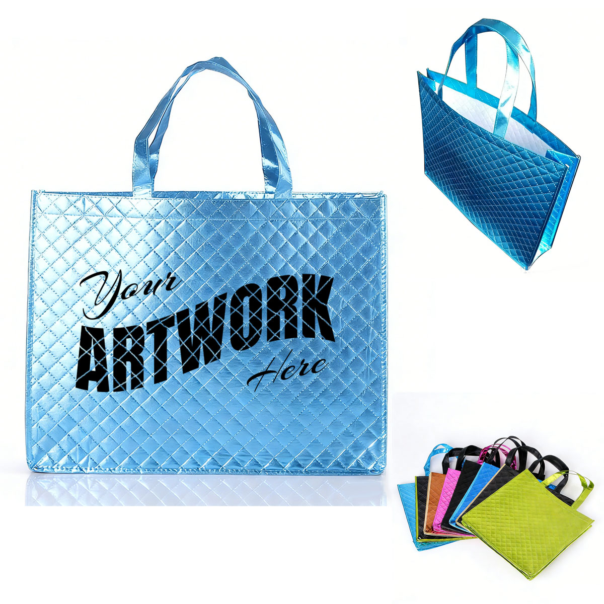 Elevate your branding experience and make a lasting impact with our reusable metallic laminated quilted bag. Made from 3 layers laminated non-woven material overlapped with laser metallic finish, reusbale, durable, recyclable and degradable. Perfect for grocery trips, giveaways, trade expos, fundraisers, and marketing events, ideal for hign end brand promotion. Our list price is based on small size W15.7" x H13.7" x D4.7", custom size is available, welcome to inquiry us!