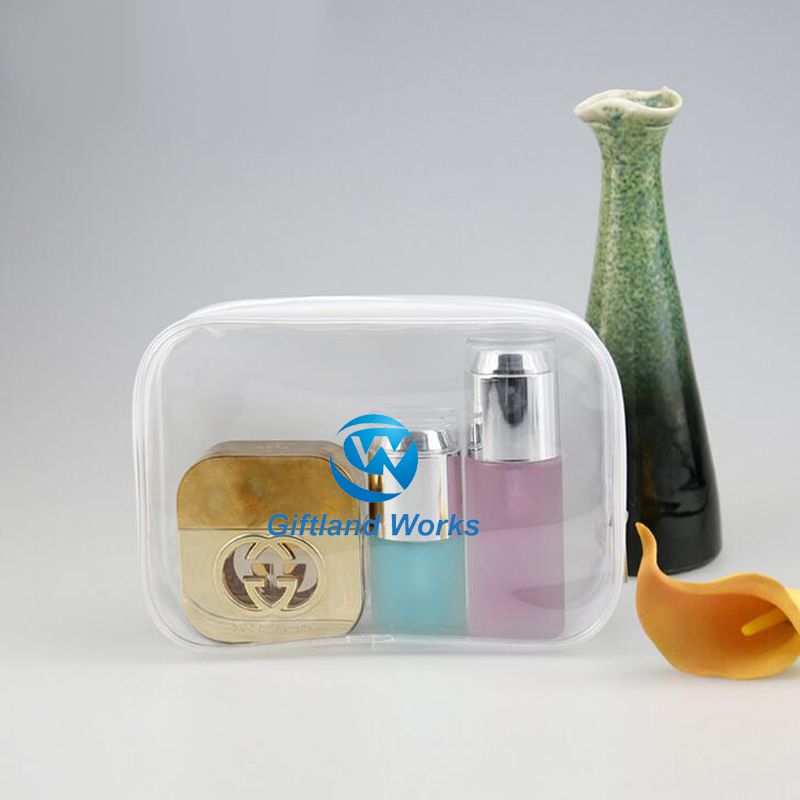 Custom quality cosmetic bag with zipper closure, made from quality PVC material. One side clear, the other side frosted color, waterproof design. Size is 6.7"x4.7"x2.4". Great item for any cosmetic selling, travel theme or other gift packing promotional purpose.