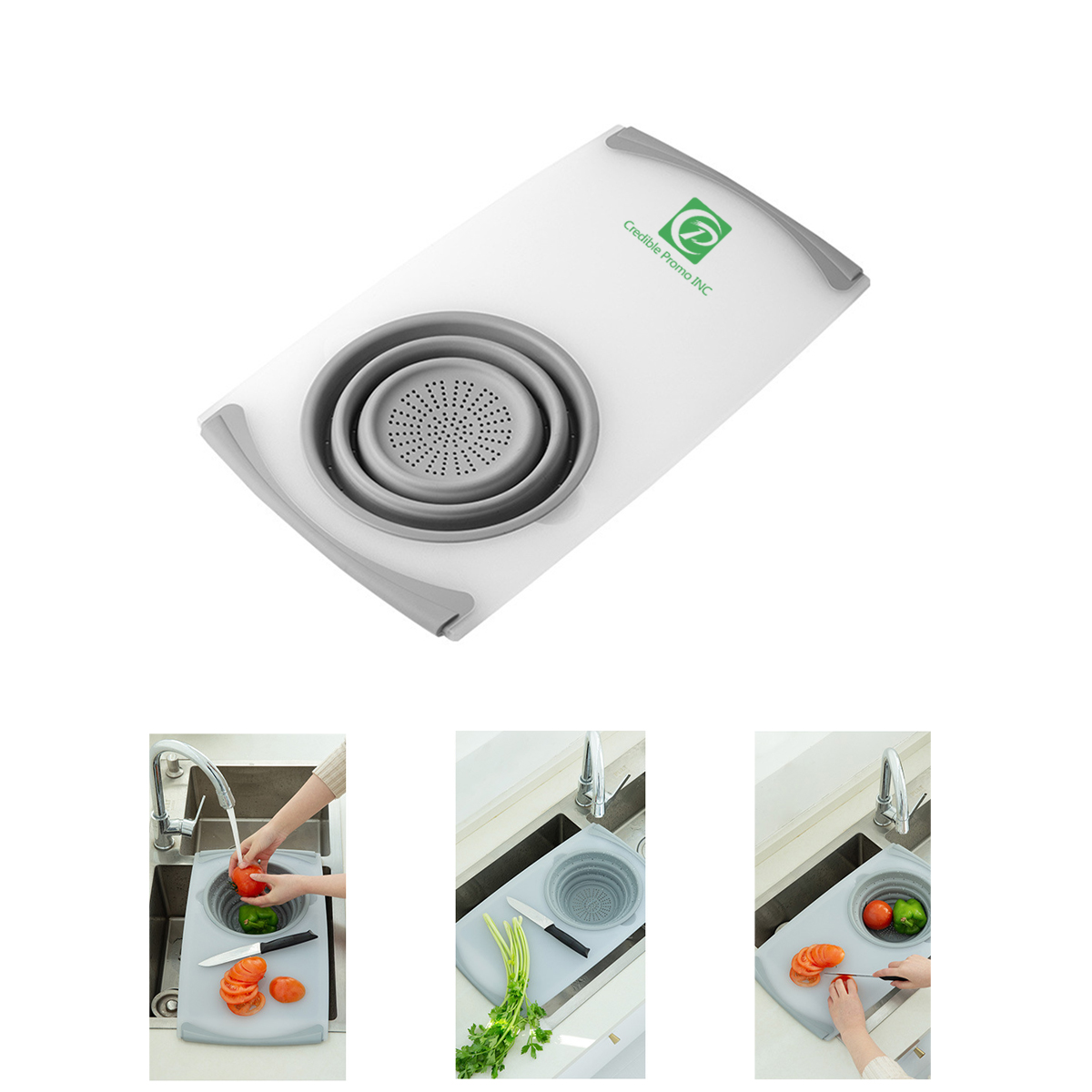Features a strainer that is removable and collapsible for easy storage. Perfect for cleaning and chopping fruits and vegetable. Non-slip rubber edges grip surfaces to keep the board securely in place during use, while raised edges direct juices toward center. Basket can be used separately as a colander. Board measures 19. 5" X 11.3".