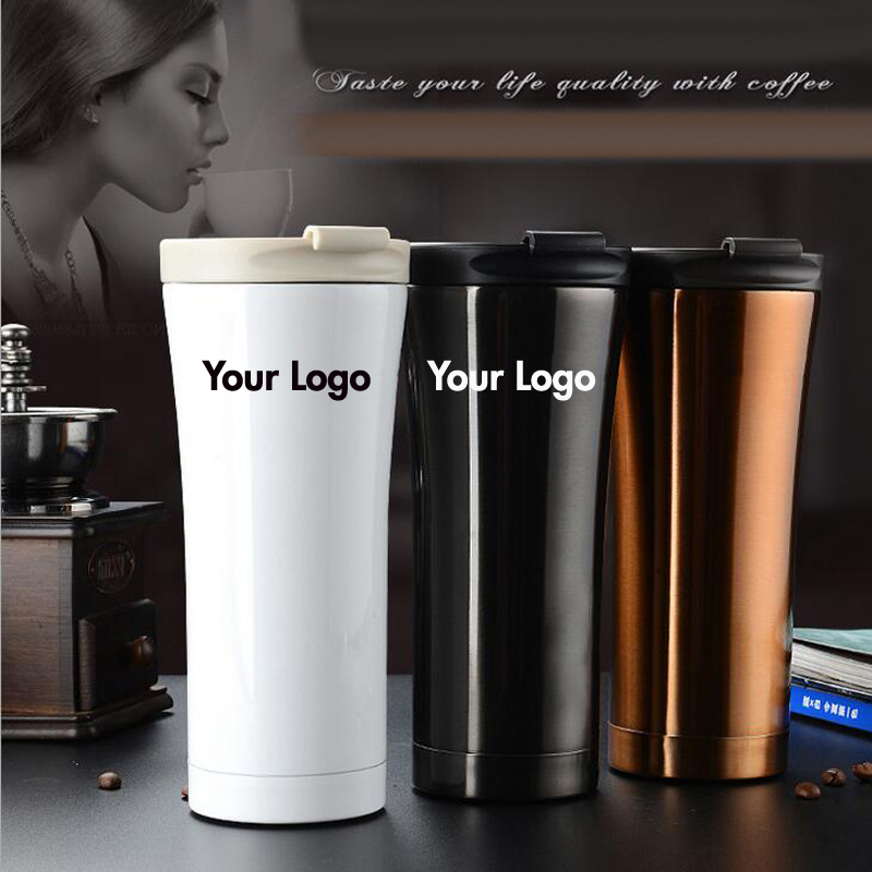 Starbucks type tumbler mug with flip lid, made from double stainless steel insulated wall, food grade material, BPA-free, nontoxic, Eco-friendly. Volume is 500 ml/18 oz. Insulation for optimal temperature, taste, flavor retention. Features a streamlined body, comfy hold, a leakproof, screw-on lid with flip sip and rubber padded base. Silicone gasket on the lid prevents messy spills and splashes. Fits most standard cup holders. Perfect promotional item, gift or souvenir.