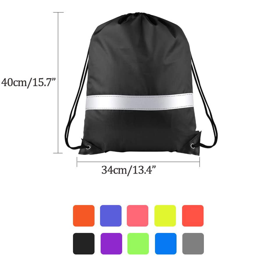 Made of 210 denier polyester, with PU leather reinforced corner, strong and durable. Measures approx. 15.7 inches in length and 13.4 inches in width, big enough to hold a digital camera, water bottle, wallet, keys, cell phone, program, sunglasses and more. String backpack with reflective strip enhances the high visibility, increase safety during walking at night. Multicolor drawstring backpack, ideal for yoga, work, travel or sport.