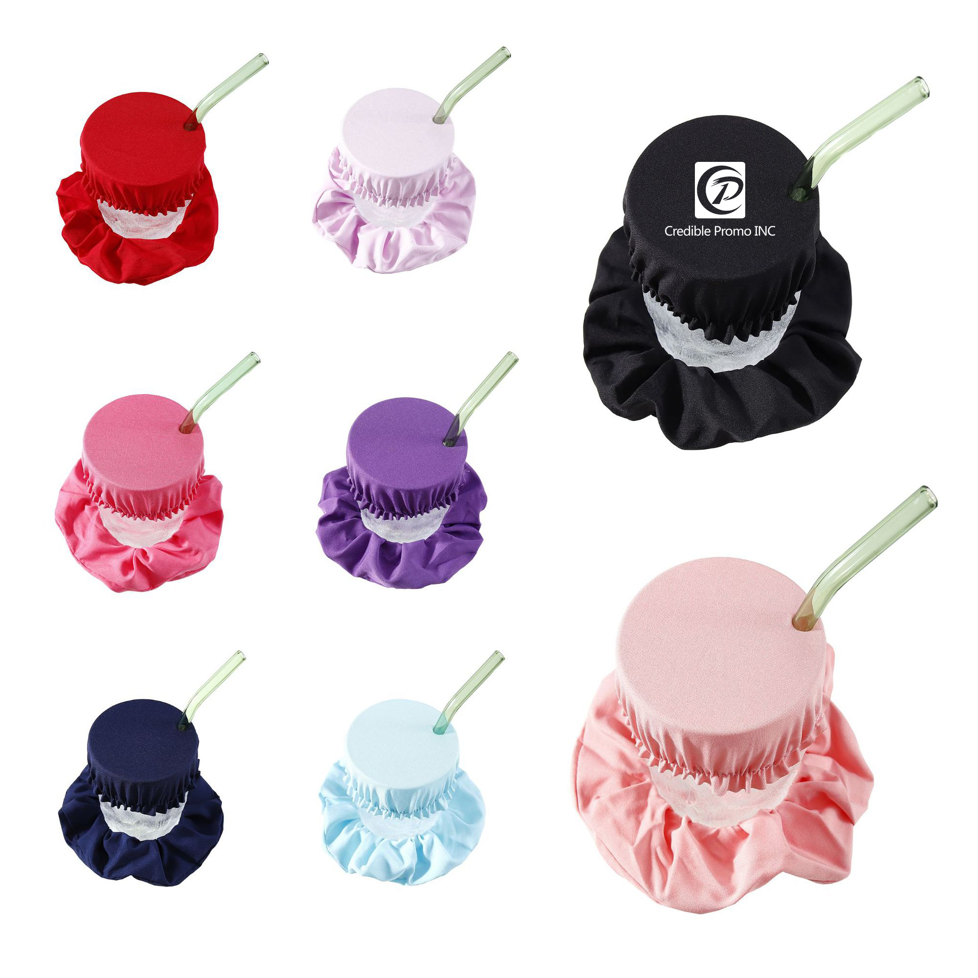 This drink cover is made of nylon/spandex allowing it to stretch to fit most cups and glasses. You should just simply wear on wrist or in your hair until needed. When ready, pull drink cover out of hidden scrunchie pocket, place over drink, pop in a straw and Enjoy! This drink cover also keeps bugs, debris and other particles out of your drink. Your logo can be customized, welcome to iunquiry us!